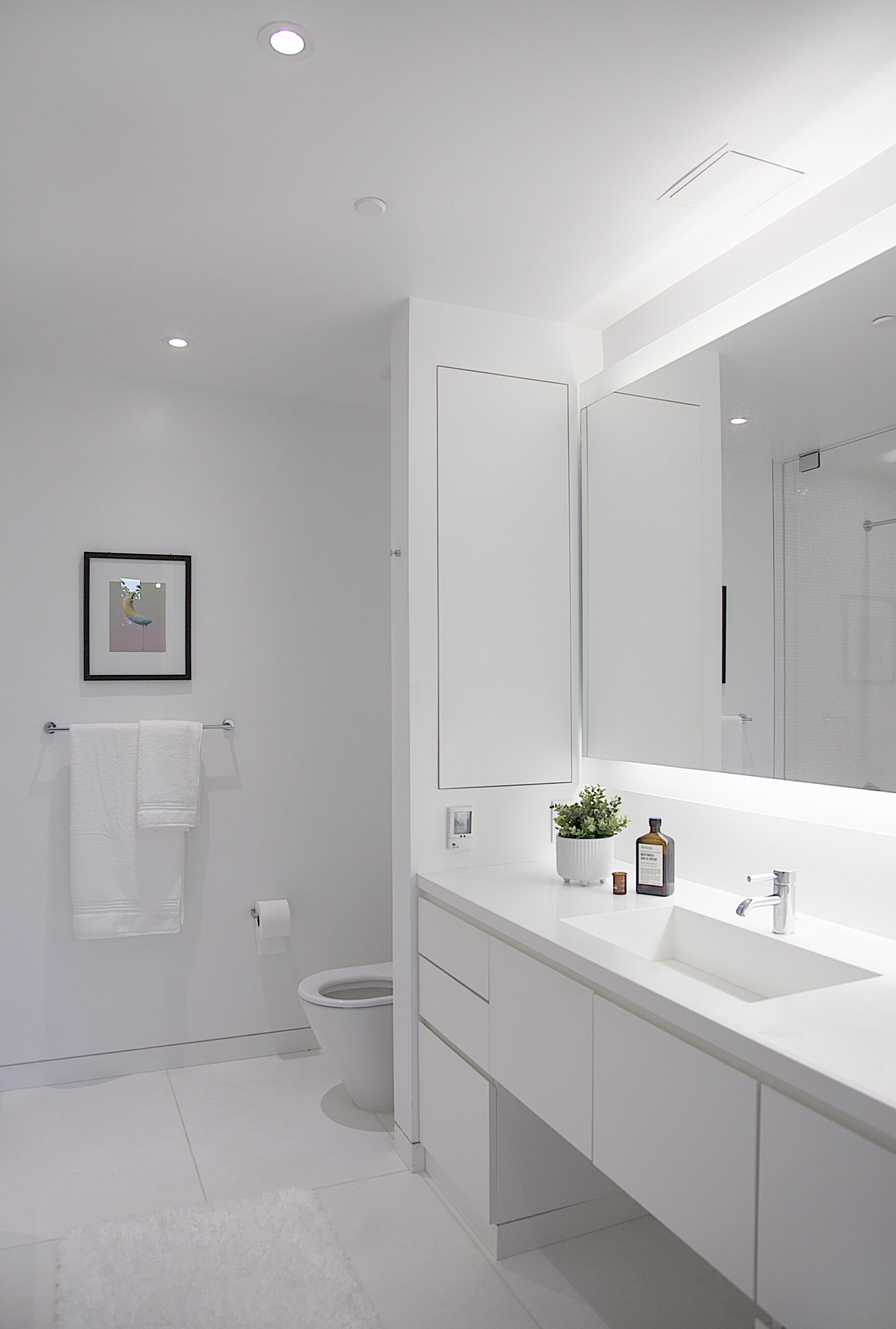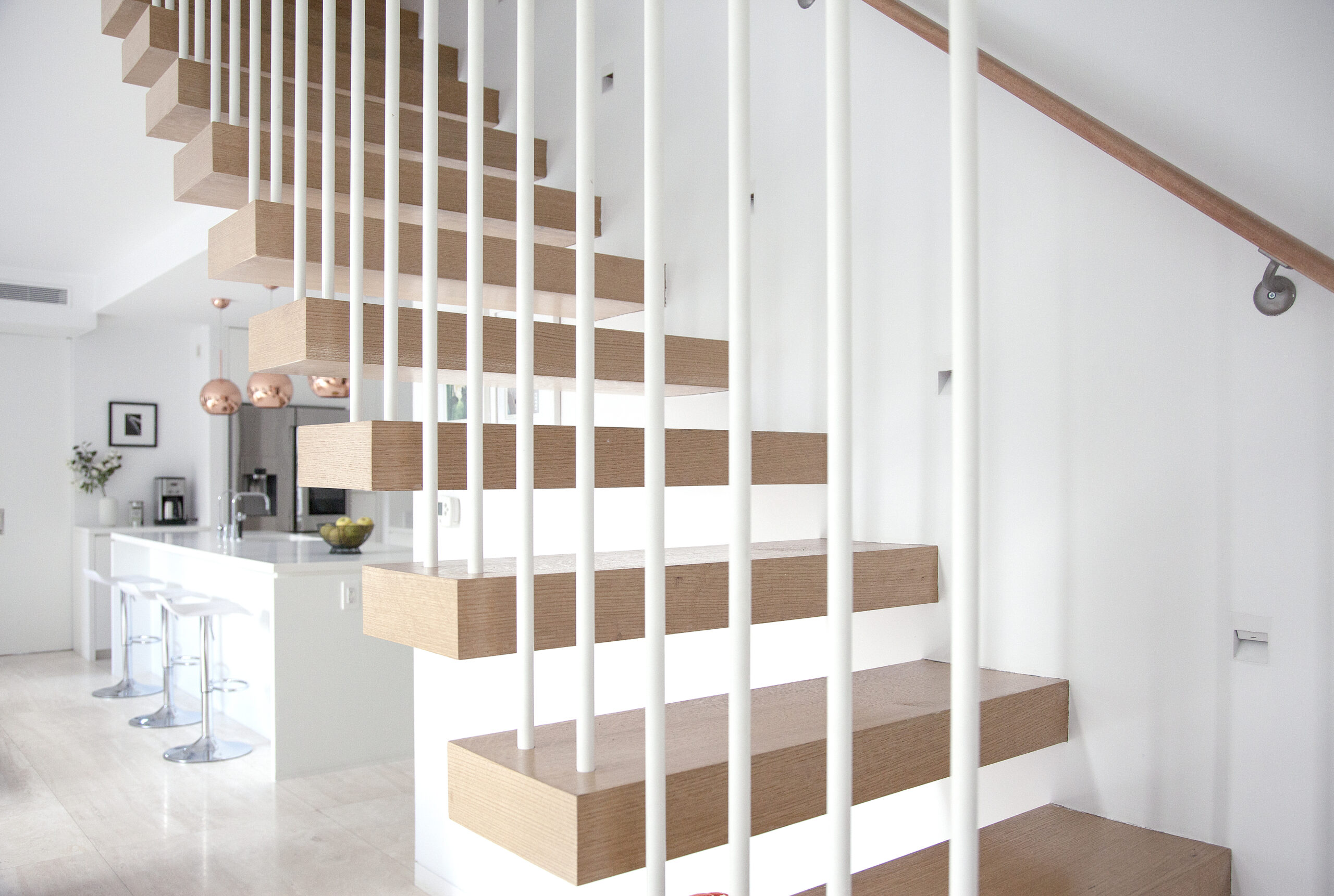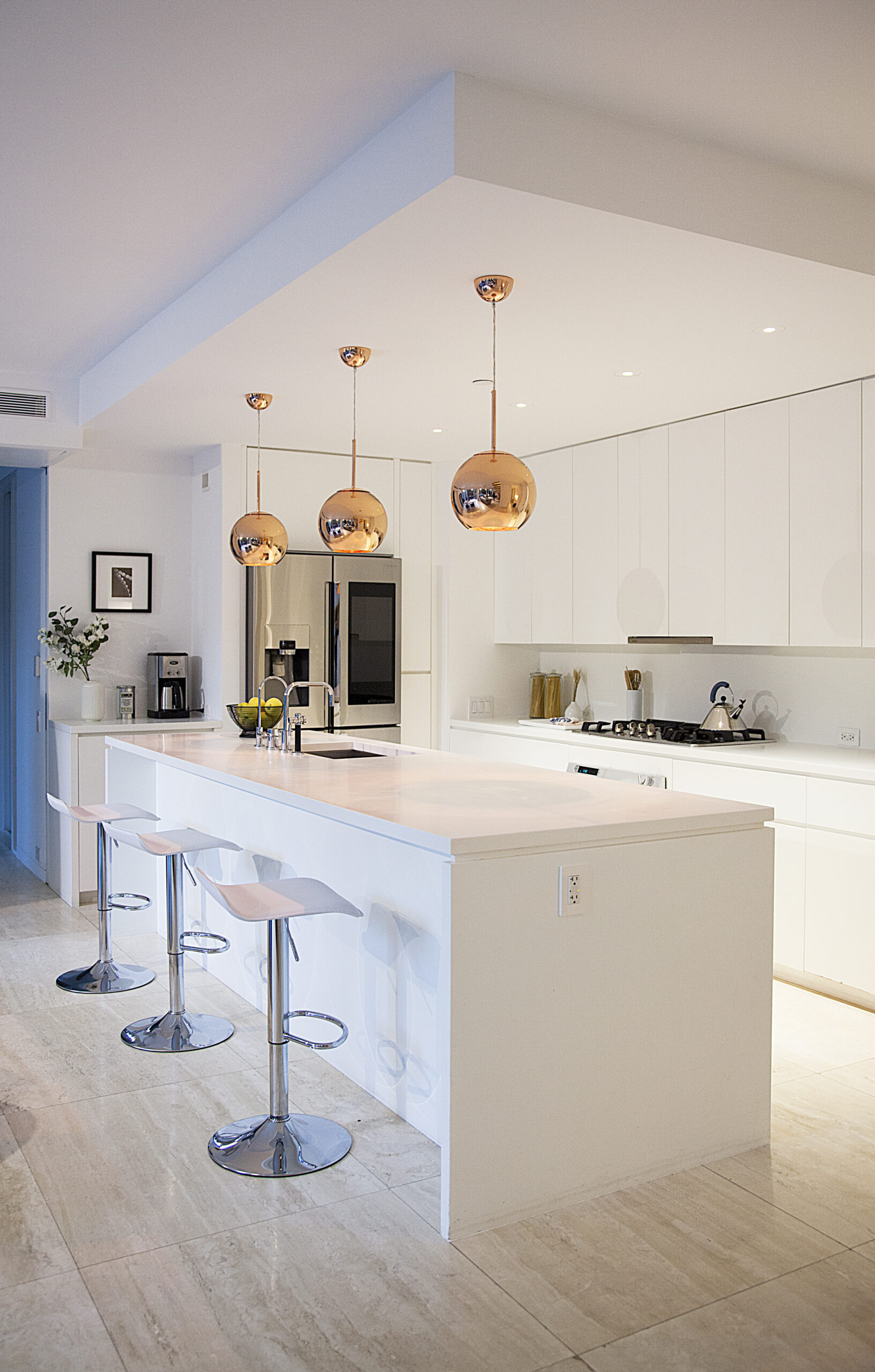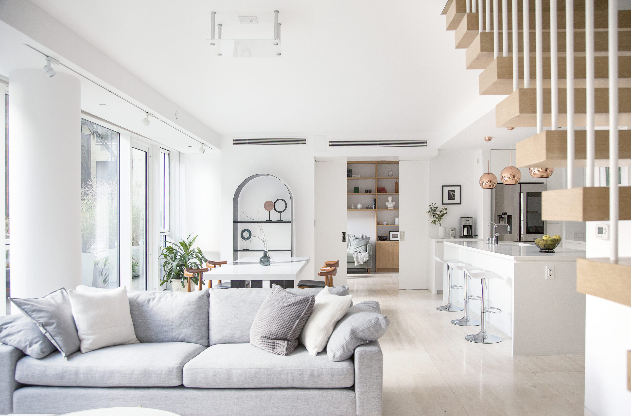 This duplex apartment was before covid. Imagine you were in a situation where you had to spend most of your time at home and work from home. And this is the best home office ever for the pandemic period- you have bright sunlight, a sofa, and a bathroom! You can go out to a spacious terrace for a refresh. (It’s almost the same size as the indoor space, bam!) Covid surely proved how much home is valuable. A simple and neat white modern kitchen is right next to the office. It is almost too close so you should be careful to eat too often… The vault stool at the home office is by Talbot&Yoon, and 3 pieces of copper LED pendants over the kitchen island are Tom Dixon‘s.