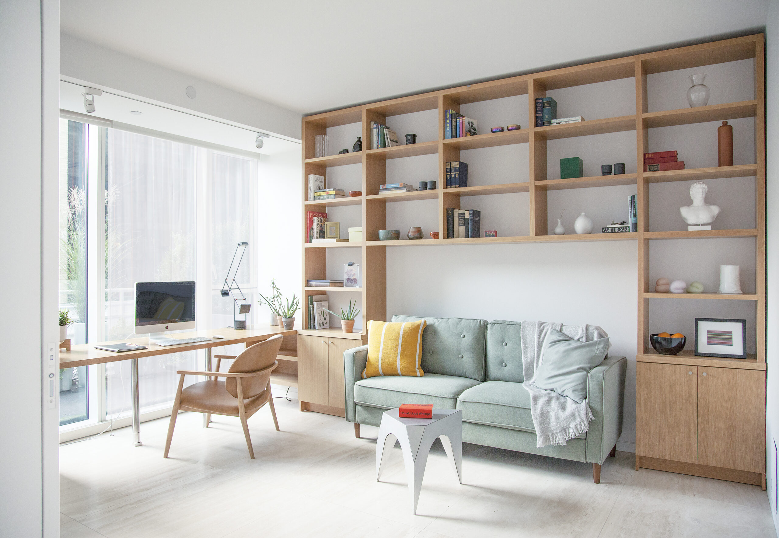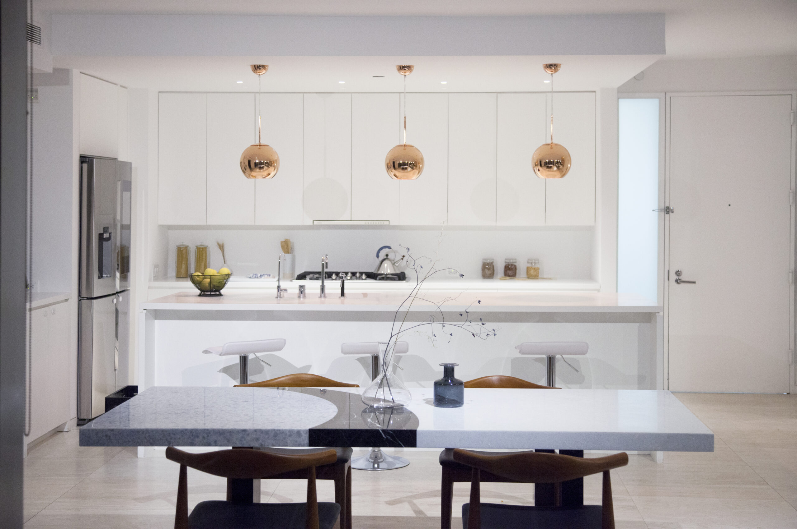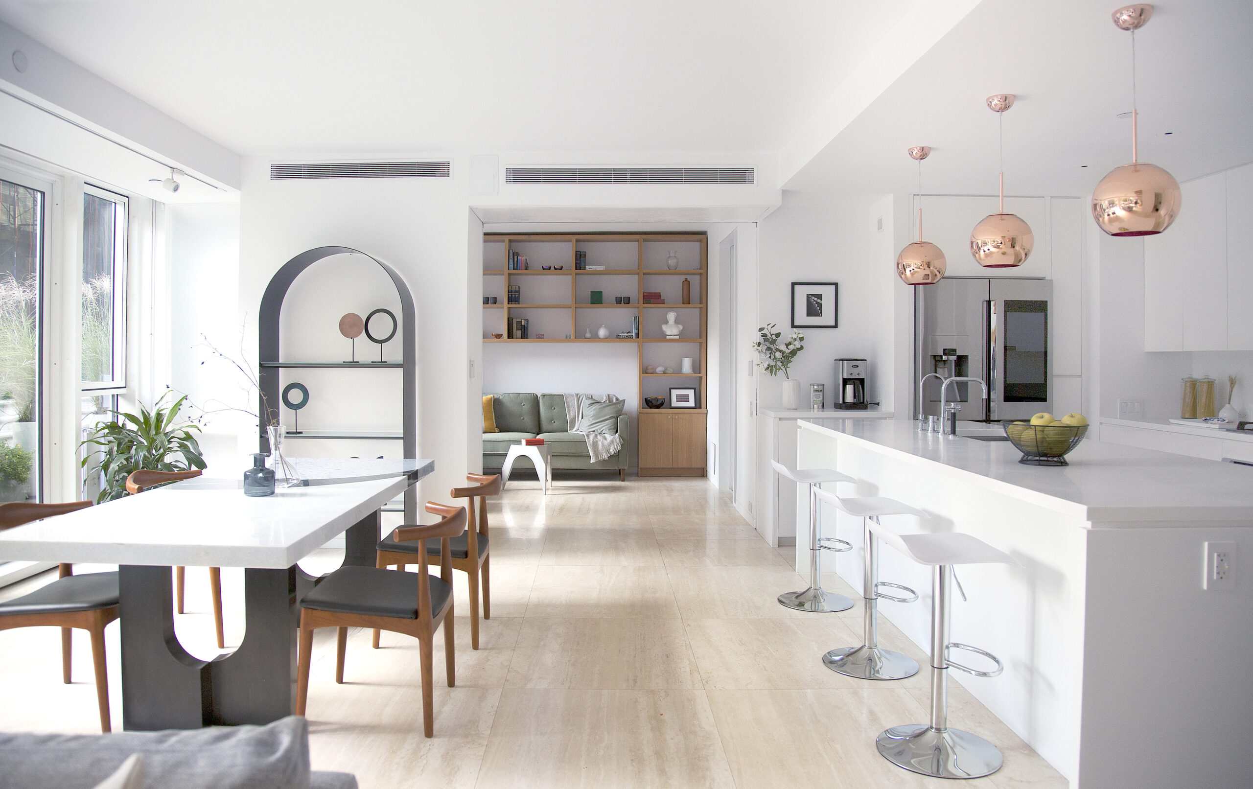 Two apartments are combined into one duplex apartment, and the custom-made stair is connecting two spaces. The white oak stair is being held from the top, and it allows visual contact through the stairs. The living area next to the stair has enough space for a sofa, coffee table, and two lounge chairs. Through big windows, ample light comes in and warms up the living and dining area and its floor. The most valuable aspect of this apartment is its travertine flooring. With travertine’s light beige color and linear pattern, the whole duplex apartment looks elegant. The dining table and unique metal shelf in the dining area are both from Kin & Company.